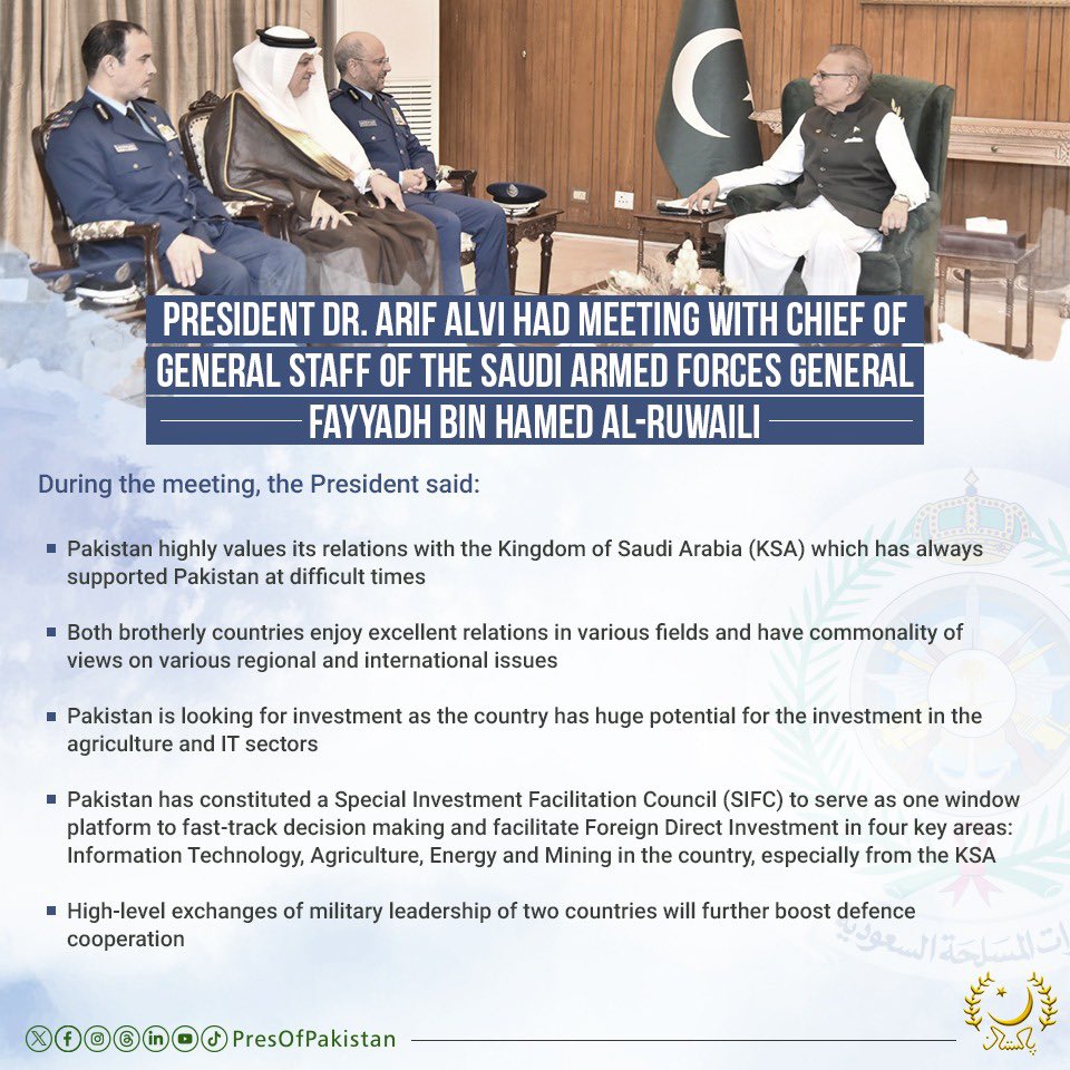 President Dr. Arif Alvi had a meeting with the Chief of General Staff of the Saudi Armed Forces General Fayyadh bin Hamed Al-Ruwaili.