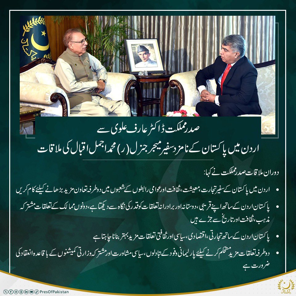 صدر مملکت ڈاکٹر عارف علوی سے اردن میں پاکستان کے نامزد سفیر میجر جنرل (ر) محمد اجمل اقبال کی ملاقات۔