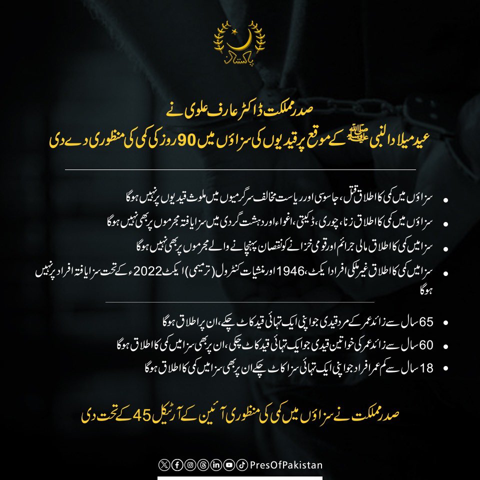 صدرمملکت نے عید میلاد النبیﷺ کےموقع پر قیدیوں کی سزاؤں میں 90روز کی کمی کی منظوری دے دی