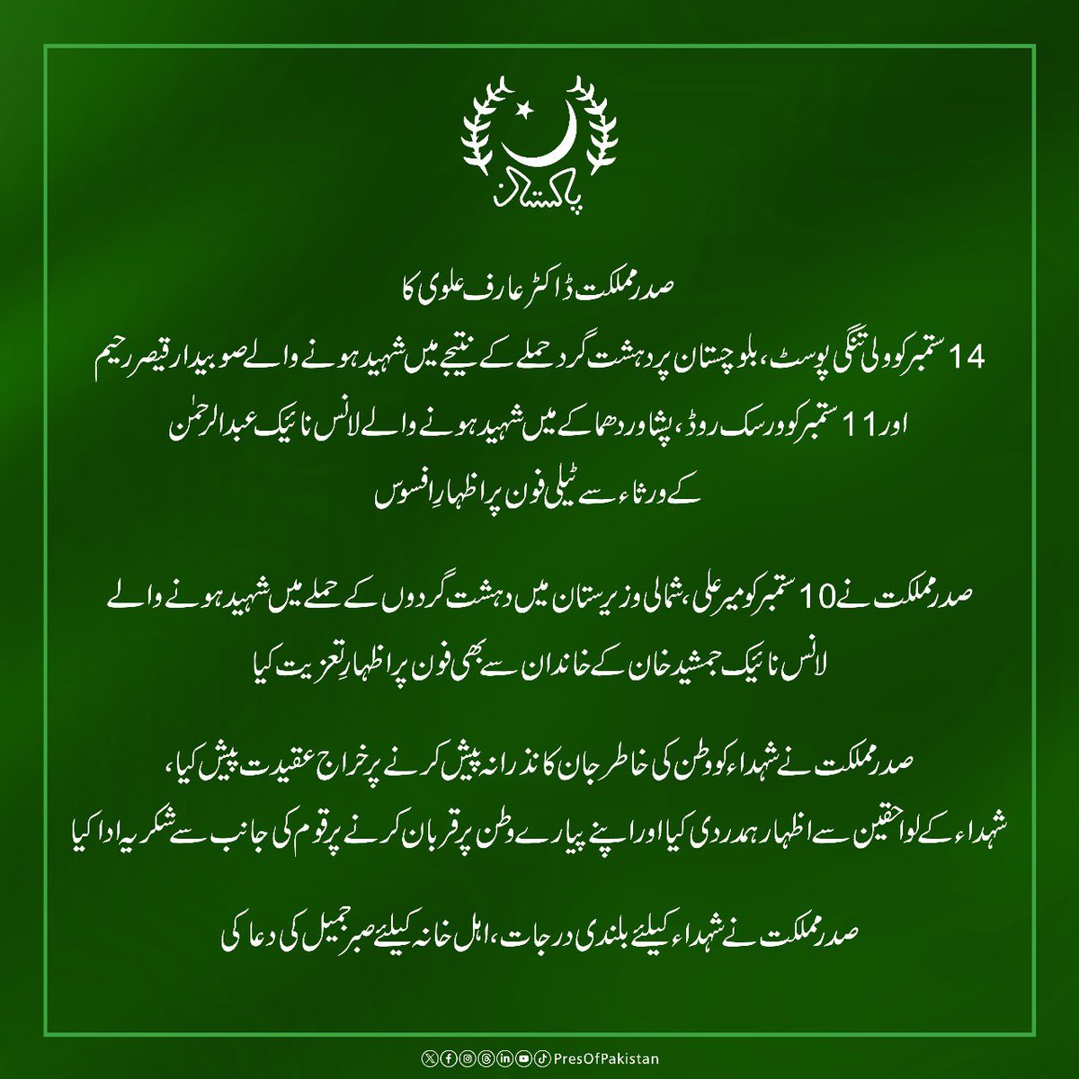 صدر مملکت نے شہداء کے لواحقین سے اظہار ہمدردی کیا اور اپنے پیارے وطن پر قربان کرنے پر قوم کی جانب سے شکریہ ادا کیا