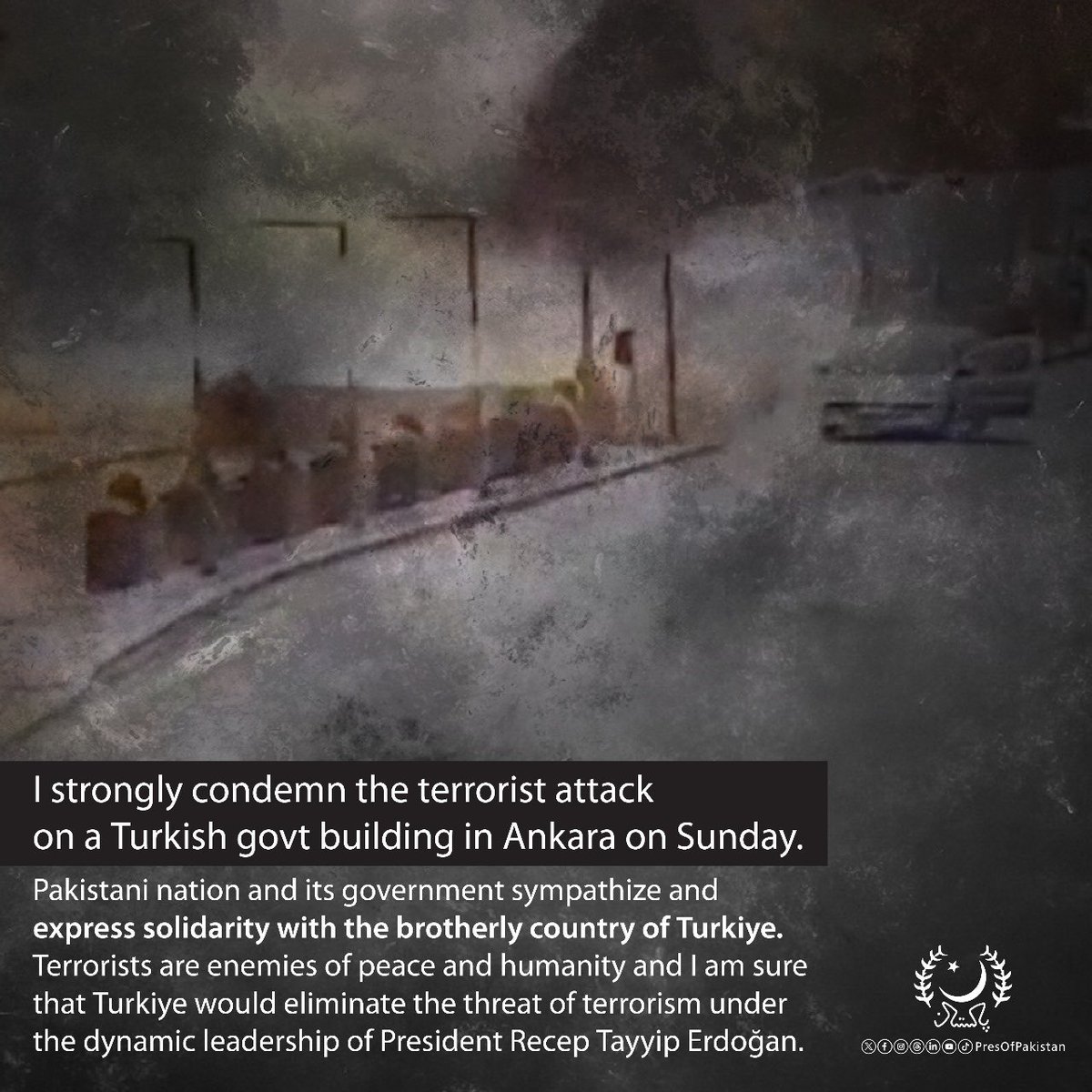 I strongly condemn the terrorist attack on a Turkish government building in Ankara on Sunday. I am sure that Turkiye would eliminate the threat of terrorism under the dynamic leadership of @RTErdogan.