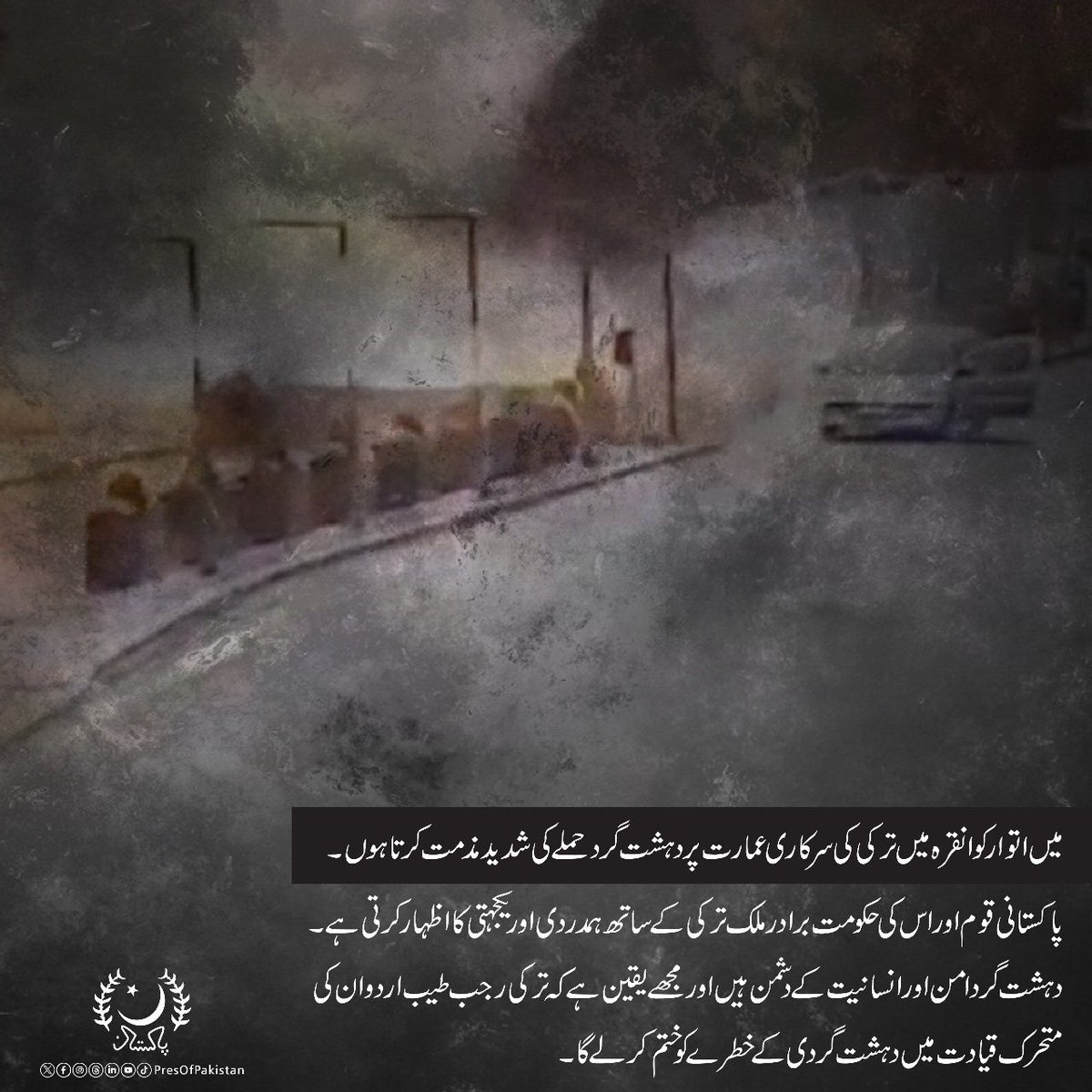میں اتوار کو انقرہ میں ترکی کی سرکاری عمارت پر دہشت گرد حملے کی شدید مذمت کرتا ہوں۔ دہشت گرد امن اور انسانیت کے دشمن ہیں اور مجھے یقین ہے کہ ترکی @RTERdogan کی متحرک قیادت میں دہشت گردی کے خطرے کو ختم کر لے گا۔