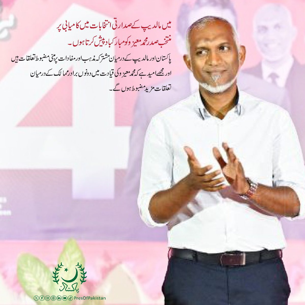 میں مالدیپ کے صدارتی انتخابات میں کامیابی پر منتخب صدر محمد معیزو کو مبارکباد پیش کرتا ہوں۔ پاکستان اور مالدیپ کے درمیان مشترکہ مذہب اور مفادات پر مبنی مضبوط تعلقات ہیں اور مجھے امید ہے کہ @MMuizzu کی قیادت میں دونوں برادر ممالک کے درمیان تعلقات مزید مضبوط ہوں گے۔