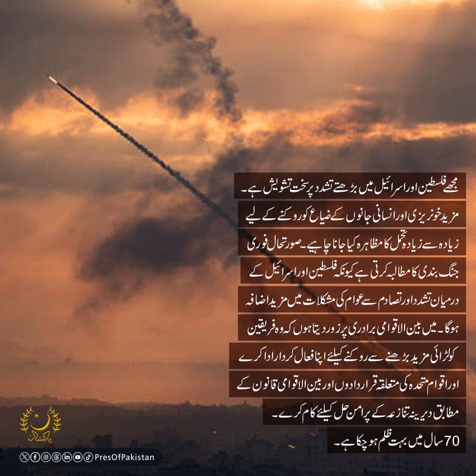 صورتحال فوری جنگ بندی کا مطالبہ کرتی ہے کیونکہ فلسطین اور اسرائیل کے درمیان تشدد اور تصادم سے عوام کی مشکلات میں مزید اضافہ ہوگا۔ میں بین الاقوامی برادری پر زور دیتا ہوں کہ وہ فریقین کو لڑائی مزید بڑھنے سے روکنے کیلئے اپنا فعال کردار ادا کرے