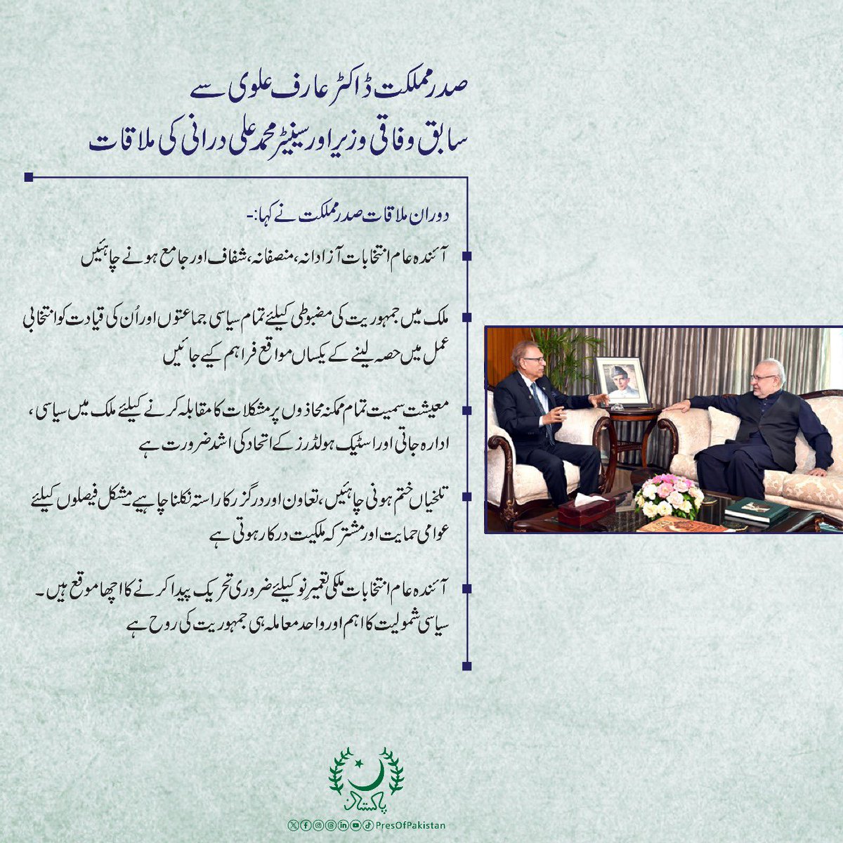 صدر مملکت ڈاکٹر عارف علوی سے سابق وفاقی وزیر اور سینیٹر محمد علی درانی کی ملاقات۔