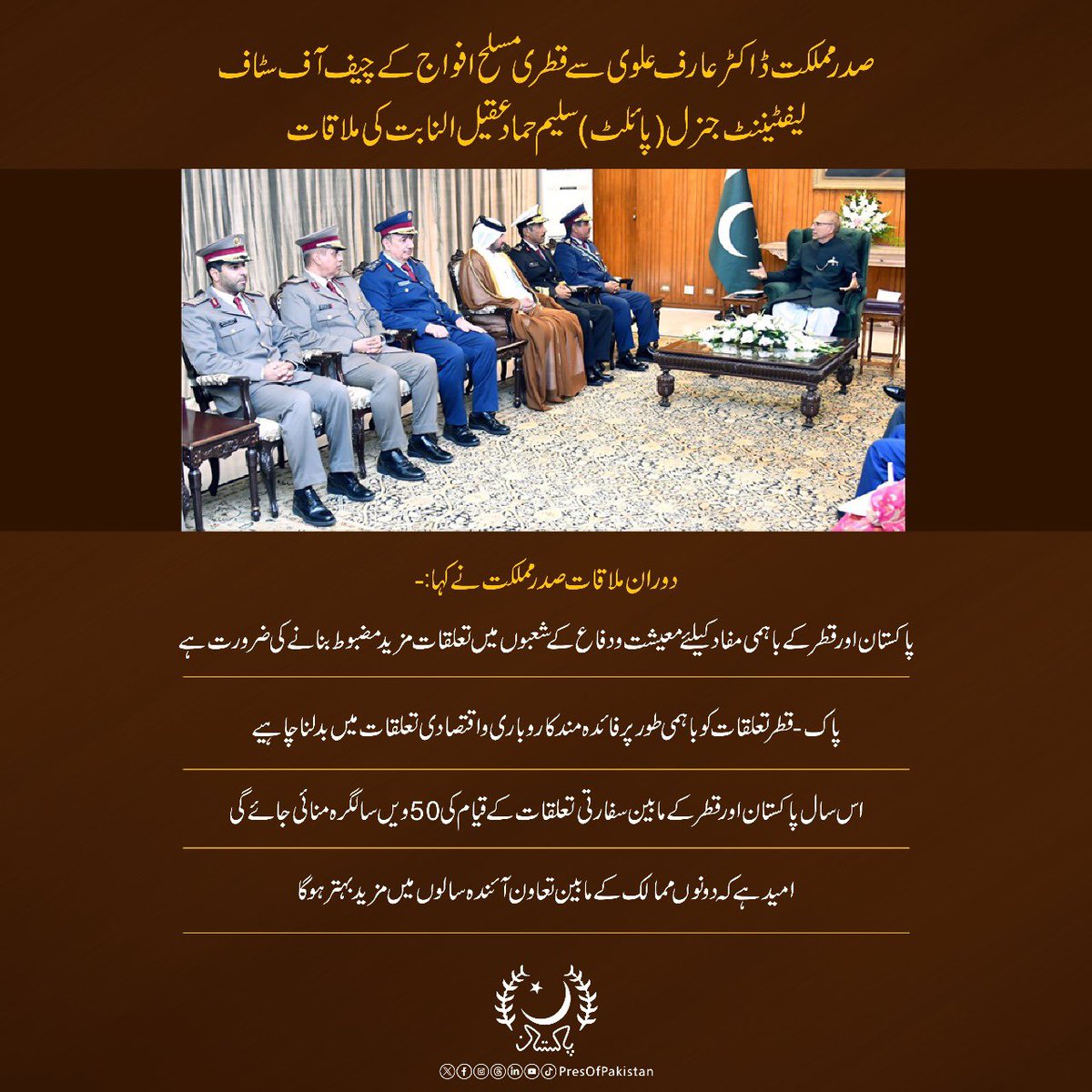 صدر مملکت ڈاکٹر عارف علوی سے قطری مسلح افواج کے چیف آف سٹاف لیفٹیننٹ جنرل (پائلٹ) سلیم حماد عقیل النابت کی ملاقات۔