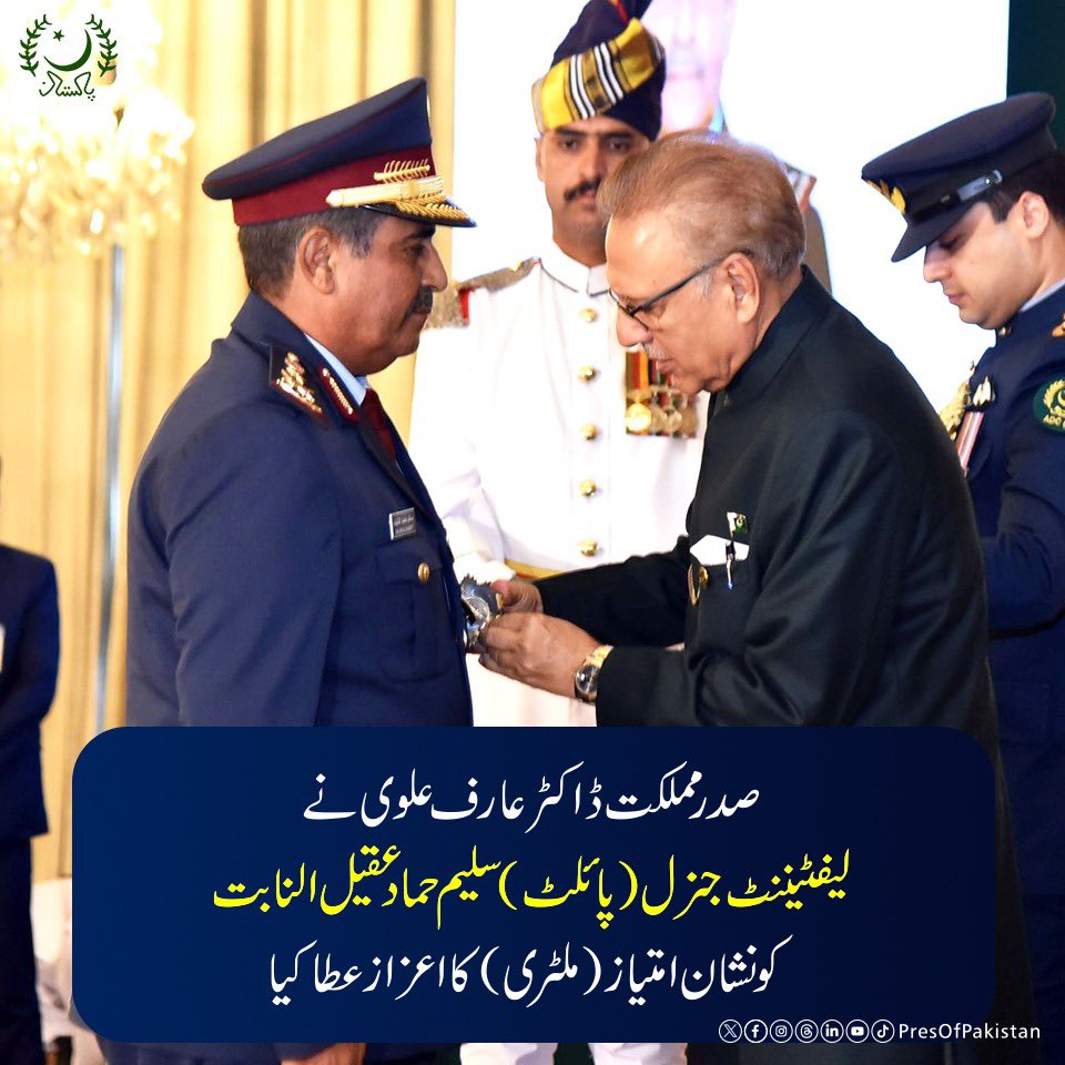 صدر مملکت ڈاکٹر عارف علوی نے لیفٹیننٹ جنرل (پائلٹ) سلیم حماد عقیل النابت کو نشان امتیاز (ملٹری) کا اعزاز عطا کیا۔