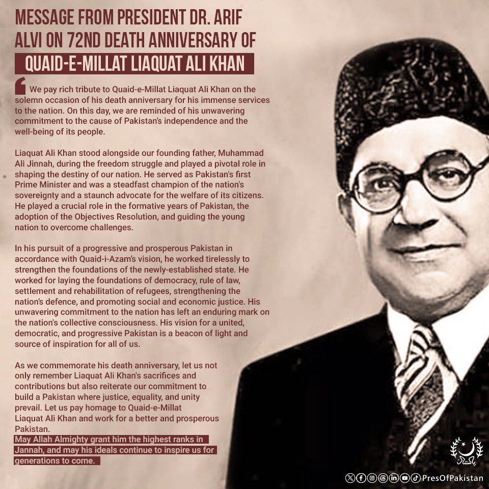 Message from President Dr. Arif Alvi on 72nd death anniversary of Quaid-e-Millat Liaquat Ali Khan.