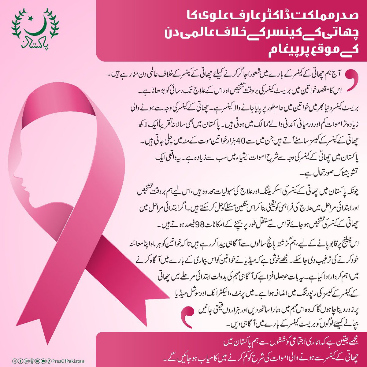 صدر مملکت ڈاکٹر عارف علوی کا چھاتی کے کینسر کے خلاف عالمی دن کے موقع پر پیغام۔