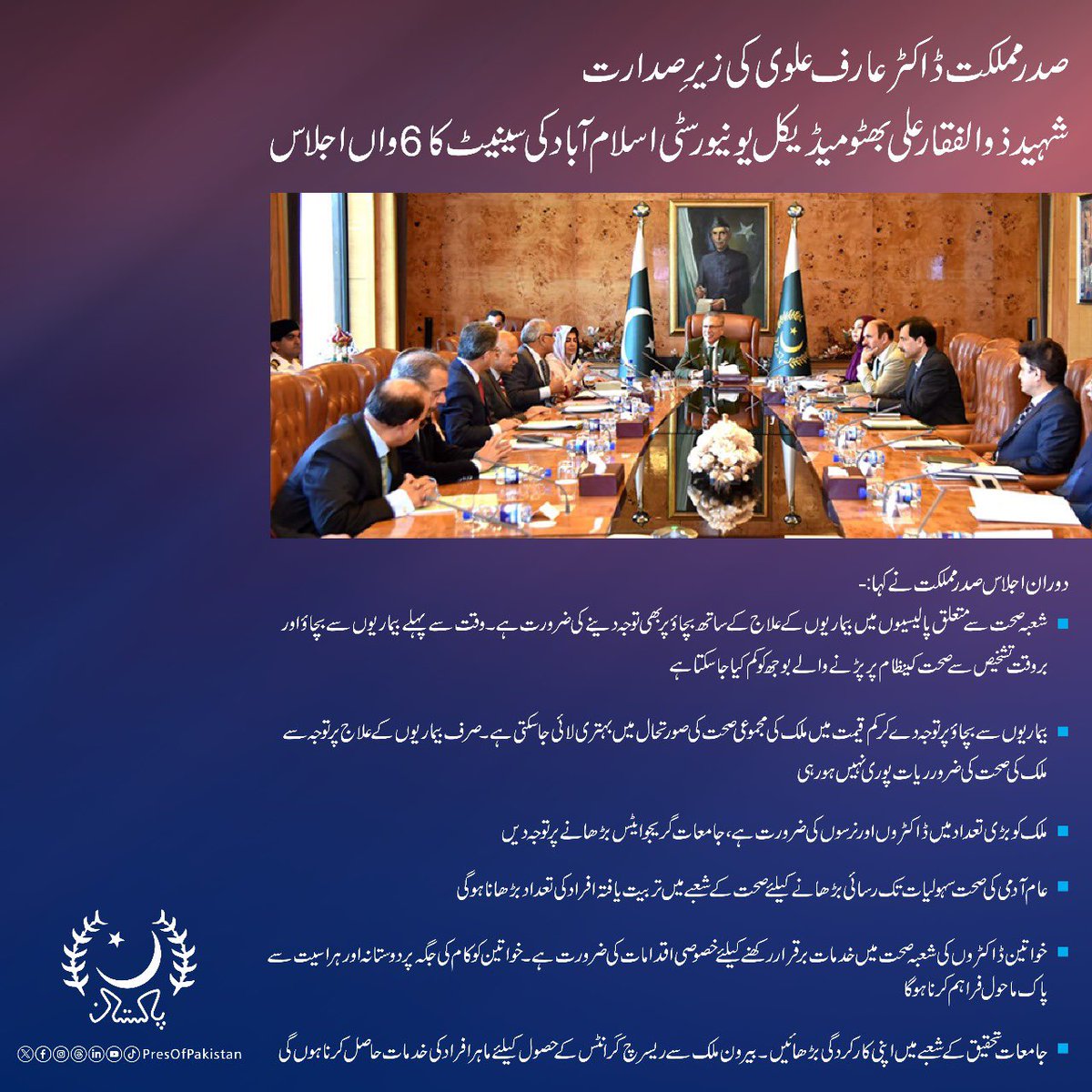 صدر مملکت ڈاکٹر عارف علوی کی زیرِصدارت شہید ذوالفقار علی بھٹو میڈیکل یونیورسٹی اسلام آباد کی سینیٹ کا 6واں اجلاس۔