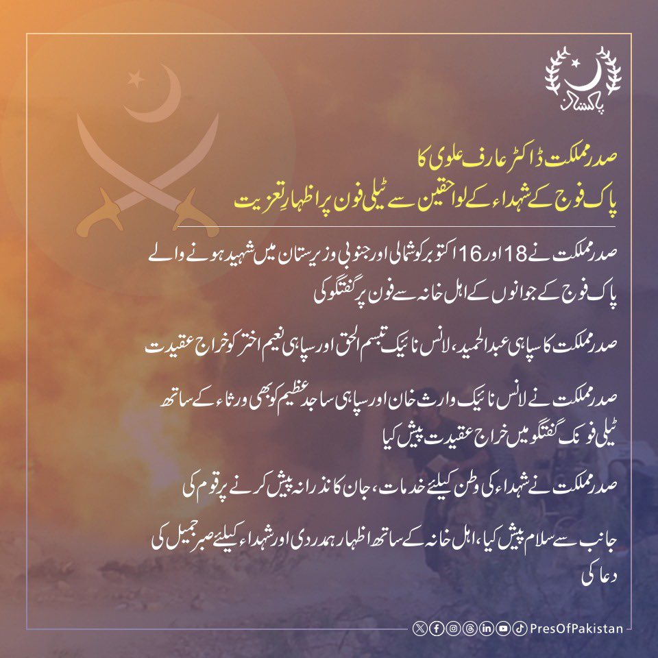 صدر مملکت نے 18 اور 16 اکتوبر کو شمالی اور جنوبی وزیرستان میں شہید ہونے والے پاک فوج کے جوانوں کے اہل خانہ سے فون پر گفتگو کی