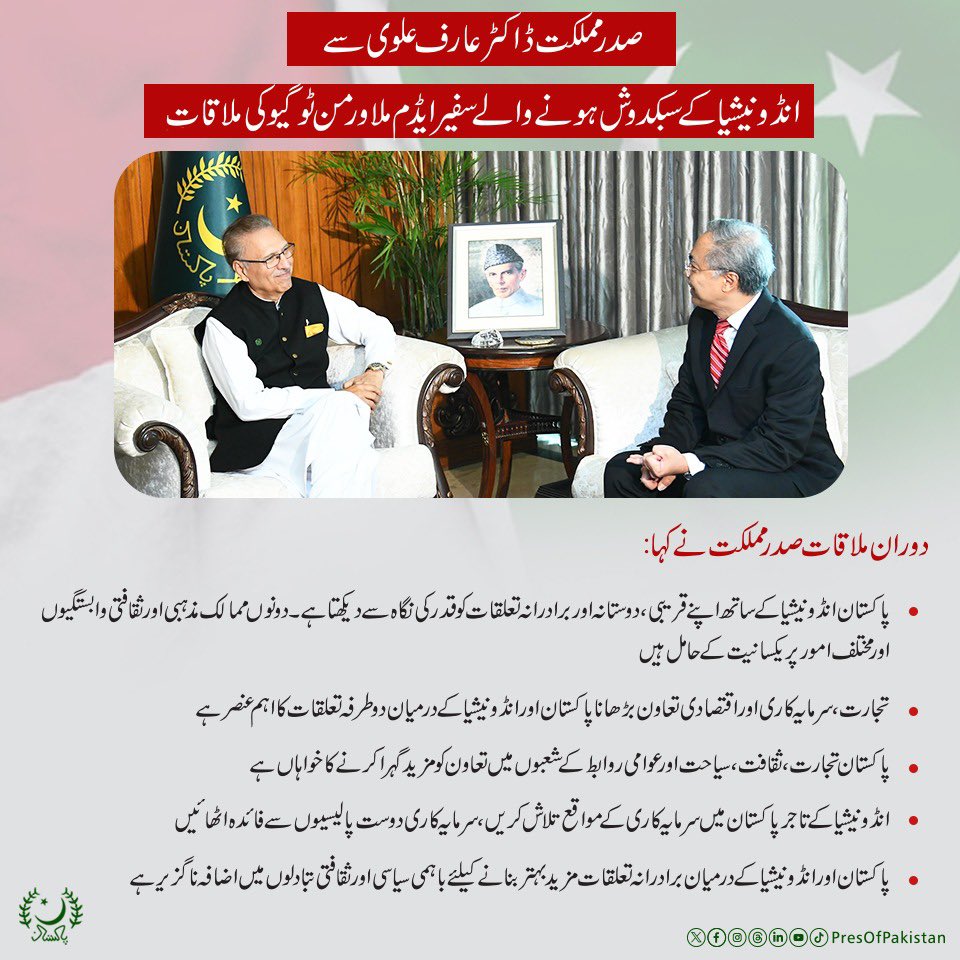 صدر مملکت ڈاکٹر عارف علوی سے انڈونیشیا کے سبکدوش ہونے والے سفیر ایڈم ملاورمن ٹوگیو کی ملاقات۔