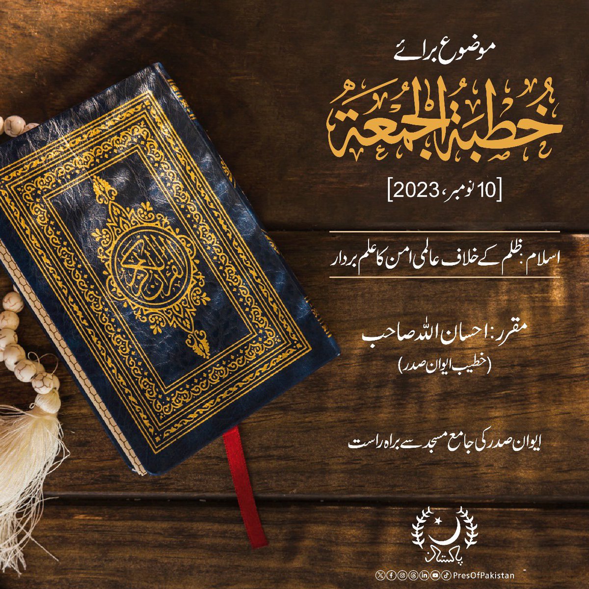 احسان اللہ صاحب “اسلام:ظلم کے خلاف عالمی امن کا علم بردار” کے موضوع پر ایوان صدر کی جامع مسجد میں خطبہ دیں گے