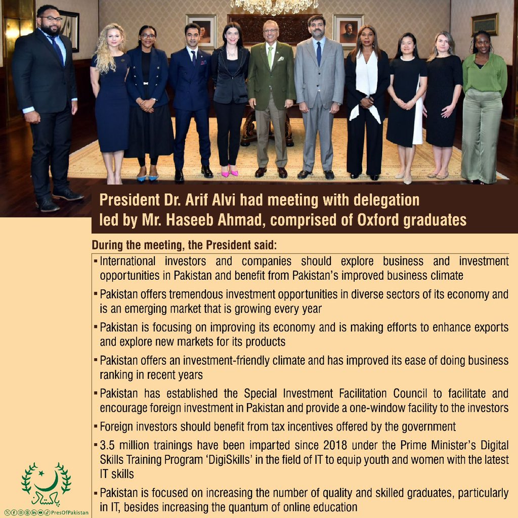President Dr. Arif Alvi had a meeting with a delegation led by Mr. Haseeb Ahmed, comprised of Oxford graduates.