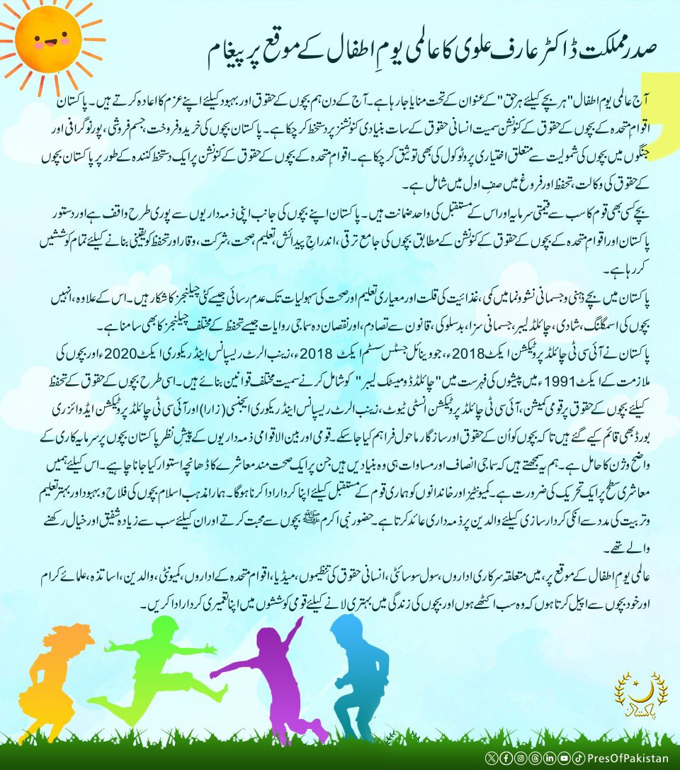 صدر مملکت ڈاکٹر عارف علوی کا عالمی یوم اطفال کے موقع پر پیغام۔